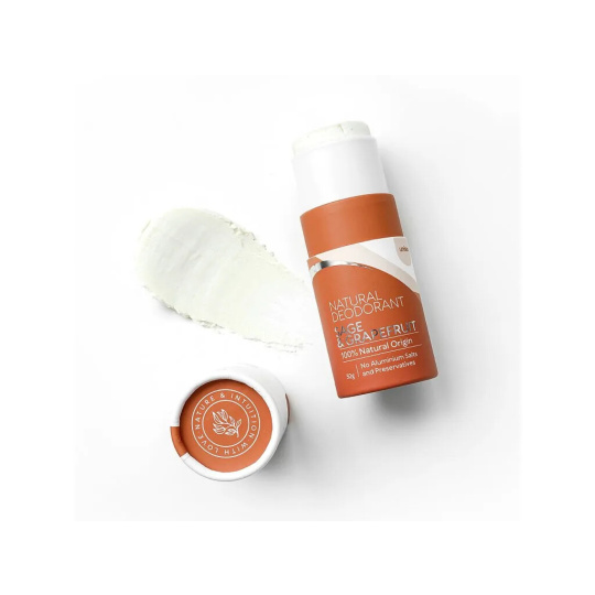 Jedlá soda, Kukuřičný škrob, Kokosový olej organický, Kokosový olej frakciovaný, Hroznový olej, Candellila Wax, Oxid zinku, Kakaové máslo dezodirizované, Zinc ricinoleate, triethyl citrate, Olivem® 900, Silica, Přírodní vitamín E, Extrakt z grapefruitových jader, Šalvějová silice, Grapefruitová silice