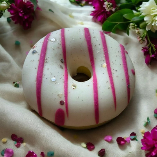 Vzhled: Mýdlo má realistický tvar donutu se zářivým a veselým zdobením, které připomíná skutečné sladkosti.