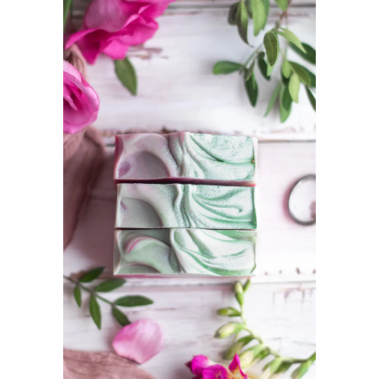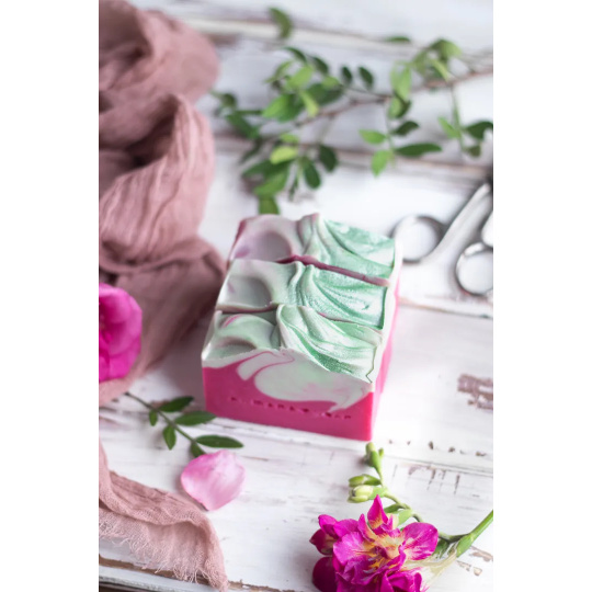 Designové ručně vyrobené mýdlo s květinovou vůní jasmínu, šalvěje a ylangu, obsahuje vysoký podíl pečlivě namíchaných rostlinných olejů, které zaručují velmi jemné, hebké mytí a pokožku zanechají vláčnou, vyživenou a nevysušenou. O krásnou barvu mýdla se postarala minerální barviva a oxid zinečnatý.