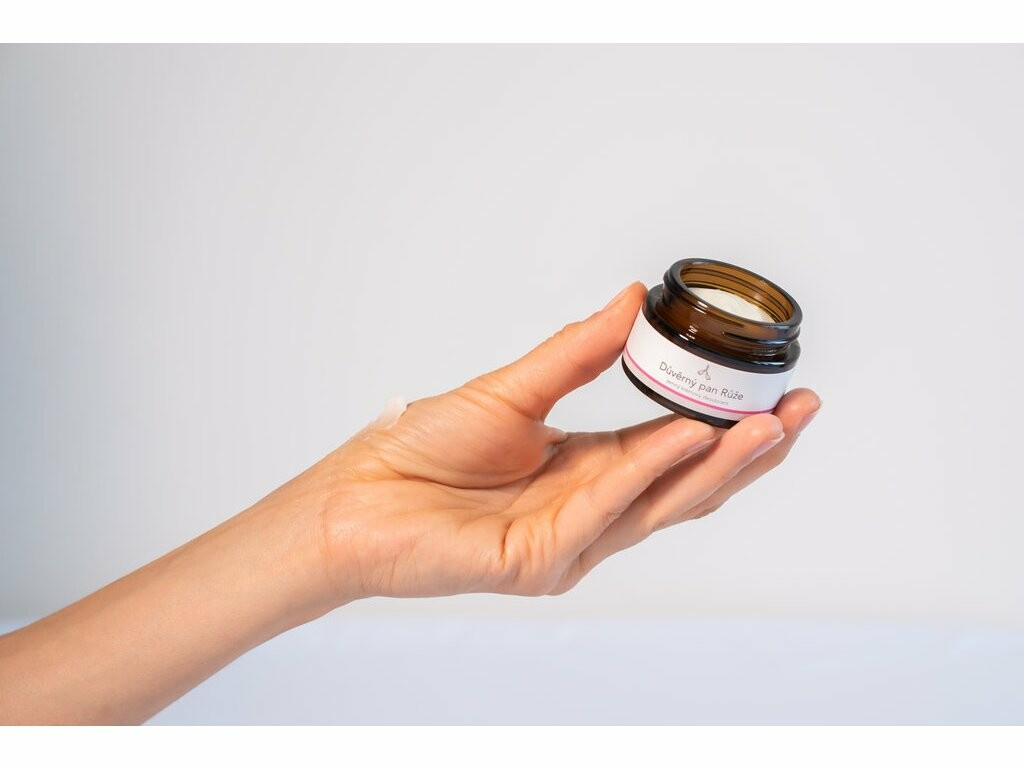 Základem Důvěrných pánů je opravdu velmi jemně mletý prášek z jedlé sody zkombinovaný se škrobem z maranty (Arrowroot), esterem kyseliny citrónové (triethyl citrát), kokosovým olejem a bambuckým máslem. Tyto ingredience dohromady tvoří jemný a hladký krém, který do podpaží snadno nanesete prsty. Soda, kokosový olej a triethyl citrát zabraňují činnosti bakterií v potu a omezují tak nepříjemný zápach. Škrob zase účinně absorbuje vlhkost a podpaží udržuje v suchu. Bio bambucké máslo a vybrané suché oleje jemně pečují o pokožku podpaží bez pocitu mastnoty. Sladká vůně růže vám zlepší náladu, zažene veškeré chmury a dodá vám sebevědomý pocit ženskosti.