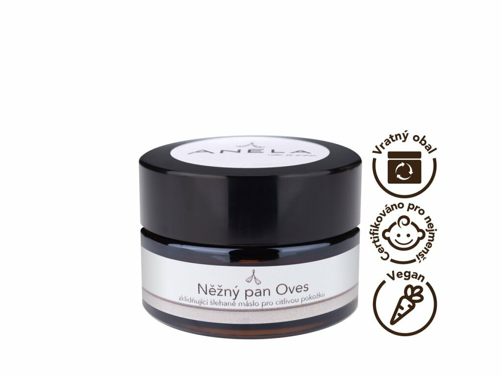 Šlehané máslo Něžný pan Oves obsahuje mnoho účinných, čistě přírodních látek, které tyto požadavky umí zajistit. Jeho konzistence je velmi lehká a nadýchaná a na kůži přímo taje a rychle se vstřebává. Můžete jej však použít také jako přísadu do koupele.
