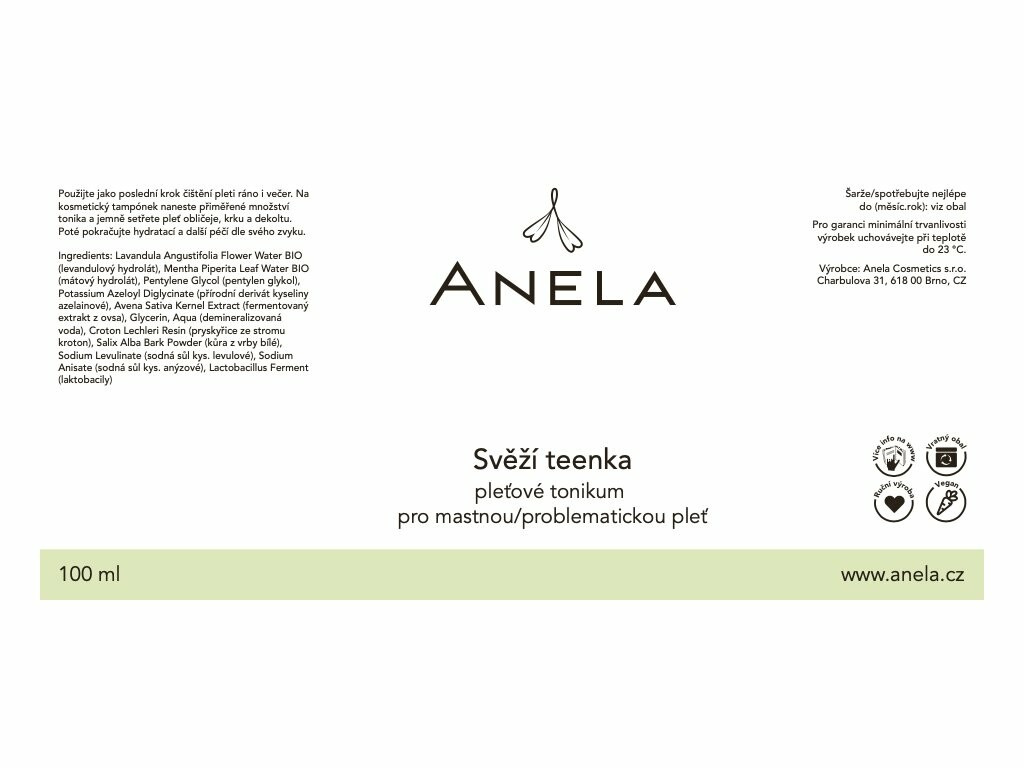 Svěží teenka je nejuniverzálnější ze všech Anela Svěžích produktů. A to jak vůní tak i použitím. Nejvíc přinese mastné a problematické pleti, ale spoustu dobrého vykoná pro všechny typy pleti. Jemně čistí, hydratuje, dezinfikuje bez vysoušení a štípání, barevně sjednocuje a pomáhá zesvětlit jizvičky i pigmentové skvrny, minimalizuje póry a zabraňuje jejich ucpávání.