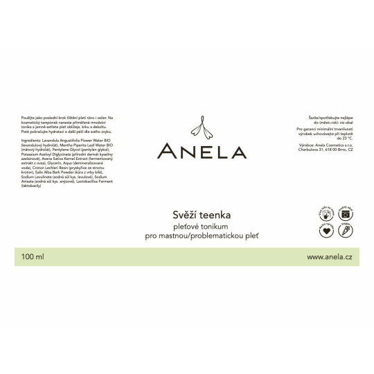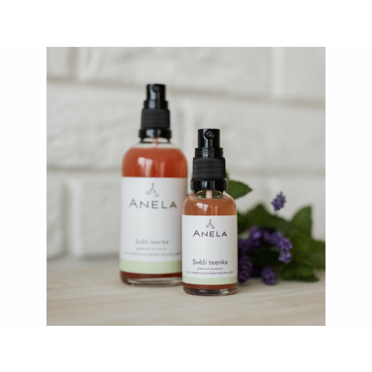 Svěží teenka je nejuniverzálnější ze všech Anela Svěžích produktů. A to jak vůní tak i použitím. Nejvíc přinese mastné a problematické pleti, ale spoustu dobrého vykoná pro všechny typy pleti. Jemně čistí, hydratuje, dezinfikuje bez vysoušení a štípání, barevně sjednocuje a pomáhá zesvětlit jizvičky i pigmentové skvrny, minimalizuje póry a zabraňuje jejich ucpávání.