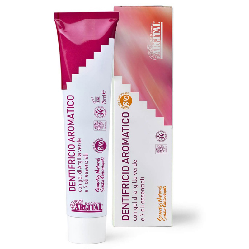 Aromatická zubní pasta se 7 esenciálními oleji Argital desinfikuje ústní dutinu, vyrovnává kyselé prostředí v ústech, absorbuje nečistoty a působí proti vytváření zubního povlaku, proti tvorbě zubního kazu a chrání dásně proti zánětu.