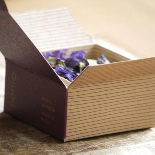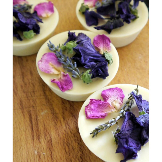 Sušené květy levandule, růže a slézu jsou pouze lehce přilepené na povrchu kostky; doporučujeme je před masáží odstranit.