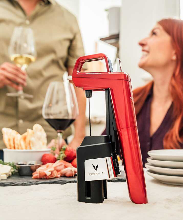 Zařízení Coravin přiložíte k hrdlu láhve, které sevřete chytrým mechanismem pro vystředění jehly na osu korku. Poté plynulým pohybem zatlačíte na horní stranu zařízení a Coravin jehla pronikne korkem bez jeho výraznějšího poškození.