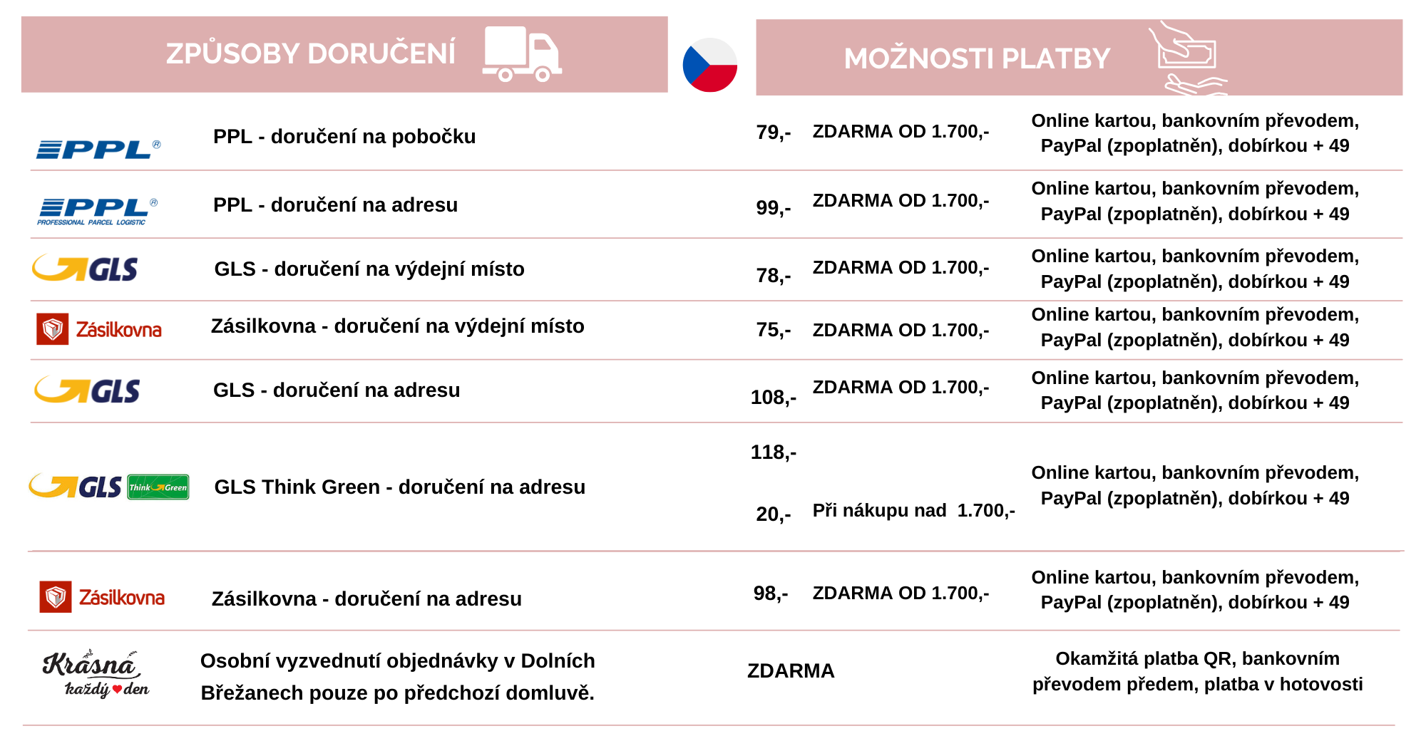 Balíčky odesíláme zpravidla následující pracovní den po obdržení Vaší objednávky a úhrady objednávky. Pokud balíček potřebujete mít do určitého data, prosím, myslete na to a vytvořte raději objednávku dříve, nebo nám napište.