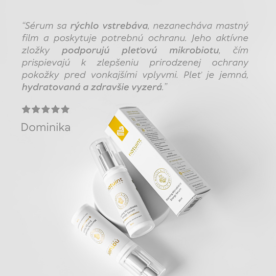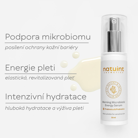 - Podpora kožního mikrobiomu: Pleť je domovem miliard mikroorganismů, které tvoří kožní mikrobiom. Tento mikrobiom je klíčový pro ochranu pleti před vnějšími vlivy a předčasným stárnutím. Natuint mikrobiotická formule podporuje rovnováhu mikroflóry pokožky, čímž pomáhá udržovat pleť zdravou, vyváženou a odolnou vůči podráždění, zánětům a škodlivým vlivům.