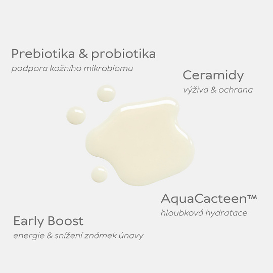 BIO Šťáva z aloe vera, BIO hydrolát ze zeleného čaje, Ceramide Complex CLRTM - voda, Phospholipids, Sphinglipids, Fucogel, aurafirm P (Lactobacillus Ferment, oves, kernel extrakt, Early BOOST (voda a extrat Jania Rubens, Sodium Carrageenan), přírodní vitamin E (Tocopherol), AquaCacteenTM (Opuntia Ficus-Indica stem extrakt, glycerin, voda), Dermochlorella (voda a extrakt z Chlorella Vulgaris), Iscaguard PFA (Phenetyl alcohol, Caprylyl glycol), kyselina citronová.