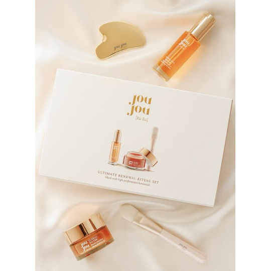 Dva z našich bestsellerů, Pleťový olej s bio retinolem Absolute Berry a Pleťová maska s květinovým filtrem, jsou nyní spojeny se dvěma speciálními dárky, které doplní váš rituál péče o pleť: značkovým obličejovým tvarovačem Gua Sha JouJou a kartáčkem na masky JouJou. Vše je pečlivě zabaleno v dárkové krabičce JouJou.