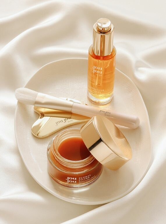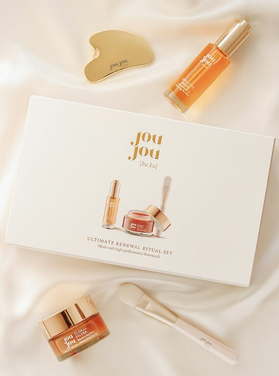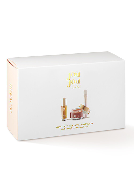 Dva z našich bestsellerů, Pleťový olej s bio retinolem Absolute Berry a Pleťová maska s květinovým filtrem, jsou nyní spojeny se dvěma speciálními dárky, které doplní váš rituál péče o pleť: značkovým obličejovým tvarovačem Gua Sha JouJou a kartáčkem na masky JouJou. Vše je pečlivě zabaleno v dárkové krabičce JouJou.