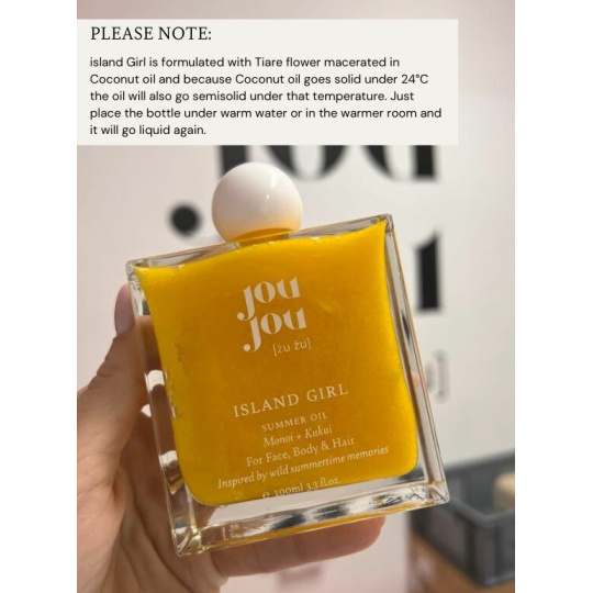 Díky bohaté směsi vysoce výživných olejů monoi + kukui, rakytníku bohatého na beta karoteny + mrkve obohacené o pokožku milující vitamin E a antioxidační malinový olej je "Island Girl" ideální pro celodenní použití na obličej, tělo i vlasy. Pro krásný a dlouhotrvající letní lesk.