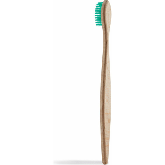 Rukojeť ze 100% biologicky odbouratelného bukového dřeva má přirozeně protiskluzový povrch. Bílé štětiny jsou vyrobeny z nylonu bez obsahu BPA a šetrně čistí zuby.