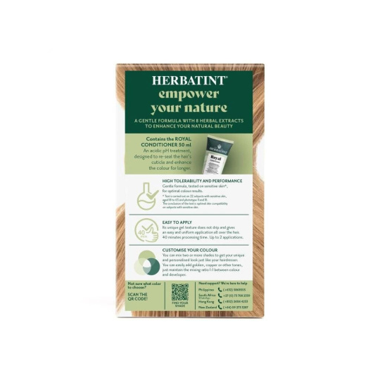 Barva dodá vlasům intenzivní barvu a lesk. Vlasy vypadají svěže, jsou zregenerované, hedvábně hladké a posílené. Díky gelové konzistenci má barva velmi jednoduchou aplikaci a je zcela bez zápachu. Celý proces barvení nezabere více než 40 minut. Navíc Herbatint netestuje své produkty na zvířatech a je také vhodný pro vegany. Na našem blogu se můžete podívat na vzorníček všech barev, které nabízíme v e-shopu. Nezapomeňte, že výsledná barva po obarvení nemusí být vždy totožná s barvou na krabičce. Záleží na původní barvě vlasů, geneticky daném pigmentu ve struktuře Vašich vlasů, který se nemusí ukázat v přirozené barvě vlasů, ale některé Herbatint barvy ho mohou zvýraznit; dále na aktuální barvě (tzn. jaká barva byla aplikovaná před Herbatintem), nebo na tom, jestli máte odrosty, šediny nebo melír.