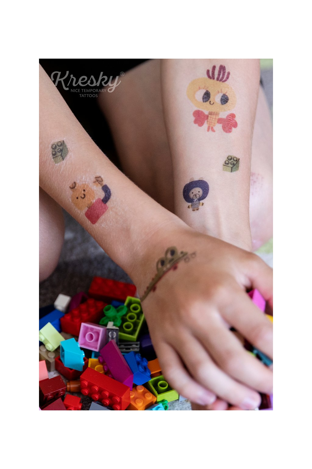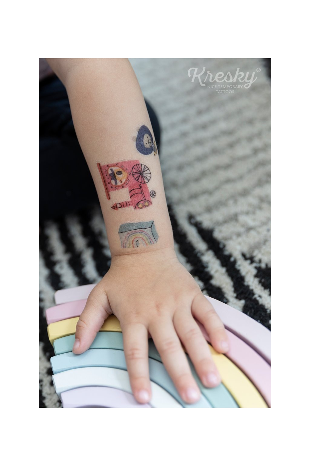 Sadu tetování s dětskými hračkami nakreslila ukrajinská ilustrátorka Sofia Tomilenko. Vybrala ikonické hračky, se kterými jsme si hráli nejen my jako děti, ale zná je i každé dnešní dítě. Dřevěné skládačky, vláček, krokodýl na provázku a plyšová hračka, ve které si každé dítě může představit, cokoli si bude chtít představit.