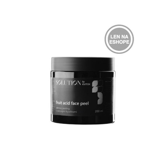 Účinnou složkou peelingu Solution by Kvitok Fruit Acid Peel jsou ovocné AHA kyseliny z borůvek, cukrové třtiny, pomeranče, citronu a javoru cukrového, které jemně a účinně odstraňují odumřelé kožní buňky a nečistoty z pokožky. V kombinaci s BHA kyselinou salicylovou (výtažek z vrby bílé) peeling čistí póry do hloubky a pomáhá odstraňovat černé tečky a ucpané póry. Revitalizuje pleť a zvyšuje účinnost dalších ošetření.