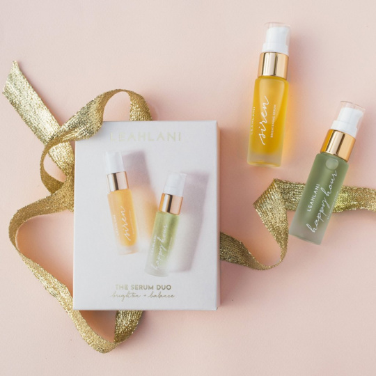 Nádherná sada Serum Duo kombinuje rozjasňující Siren sérum s balančním sérem Happy Hour Duo. Sada je vhodná pro všechny milovnice kosmetiky Leahlani, i ty, které si chtějí produkty teprve vyzkoušet. Rozjasňující a balanční sérum v balení 2 x 15 ml je ideální na cestovní. Výrobky Leahlani Skincare jsou vyráběny čerstvé v malých dávkách z vysoce kvalitních organických divoce rostoucích plodin, z místních havajských ingrediencí. Jsou 100% bez chemických složek, syntetických barviv a vonných látek, samozřejmostí je, že všechny produkty nejsou testovány na zvířatech.
