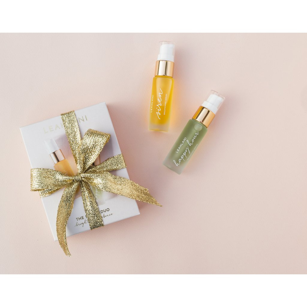 Nádherná sada Serum Duo kombinuje rozjasňující Siren sérum s balančním sérem Happy Hour Duo. Sada je vhodná pro všechny milovnice kosmetiky Leahlani, i ty, které si chtějí produkty teprve vyzkoušet. Rozjasňující a balanční sérum v balení 2 x 15 ml je ideální na cestovní. Výrobky Leahlani Skincare jsou vyráběny čerstvé v malých dávkách z vysoce kvalitních organických divoce rostoucích plodin, z místních havajských ingrediencí. Jsou 100% bez chemických složek, syntetických barviv a vonných látek, samozřejmostí je, že všechny produkty nejsou testovány na zvířatech.