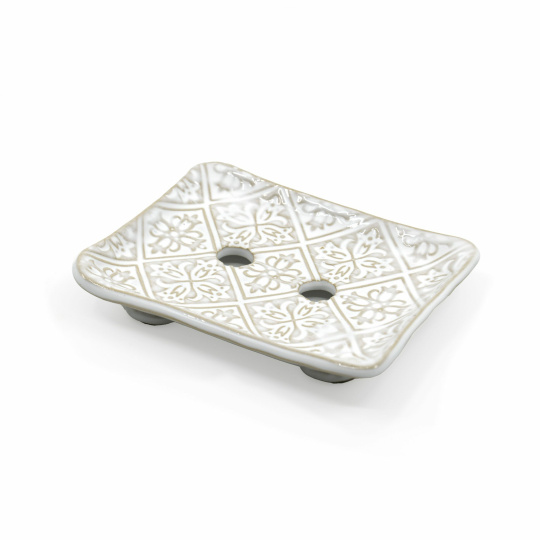 Mýdlenka na nožičkách, s otvory ve tvaru kroužků pro odtok vody. 100% ruční výroba: modelováno, malováno, glazováno.