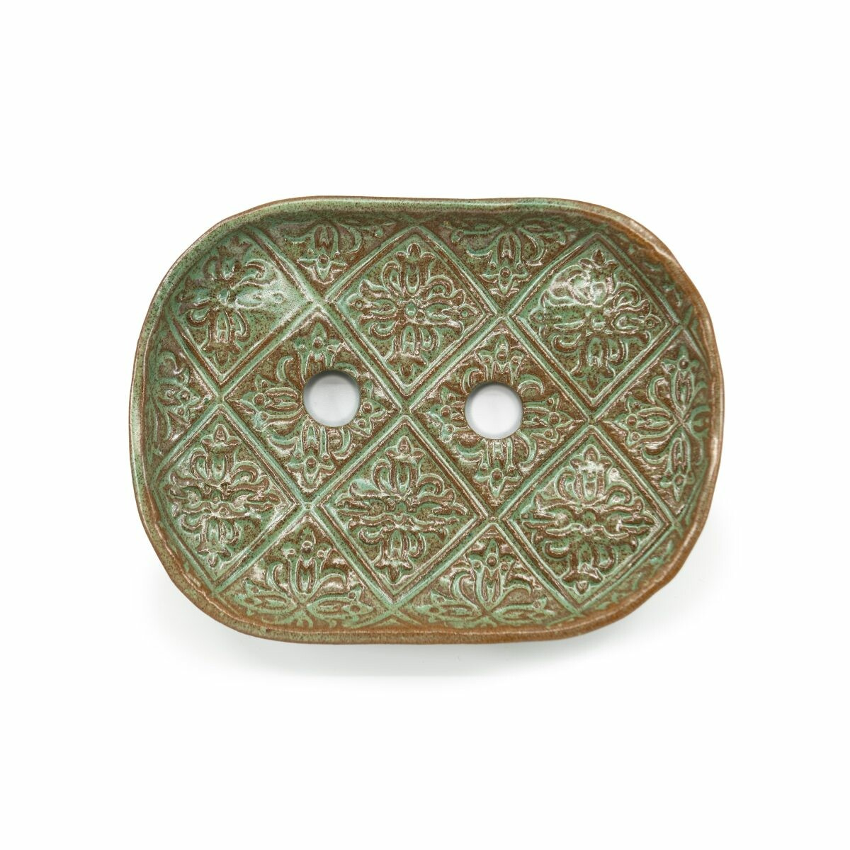 Mýdlenka na nožičkách, s otvory ve tvaru kroužků pro odtok vody. 100% ruční výroba: modelováno, malováno, glazováno.