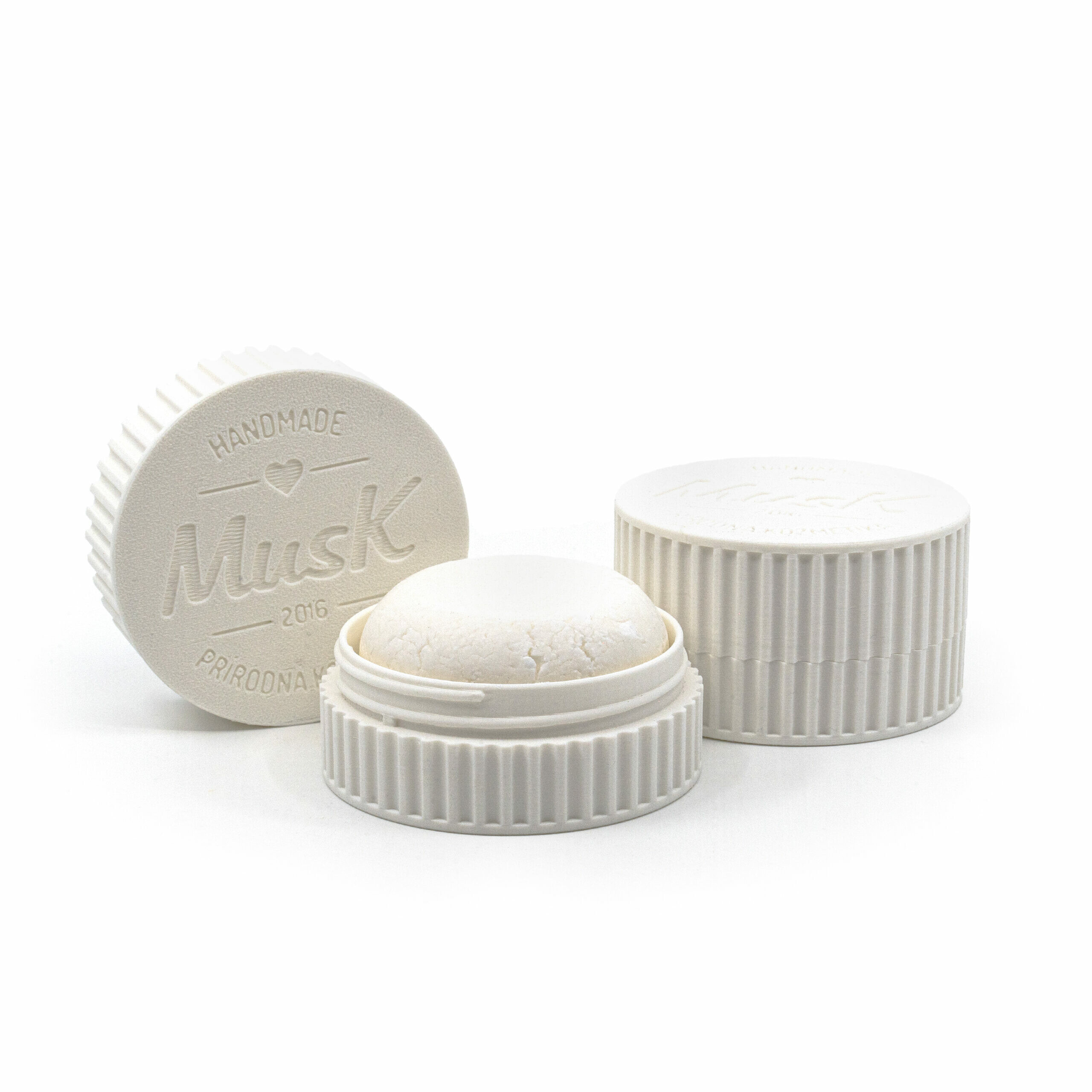 Dóza s průměrem 70 mm je ideální pro 80g MusK tuhé šampony.