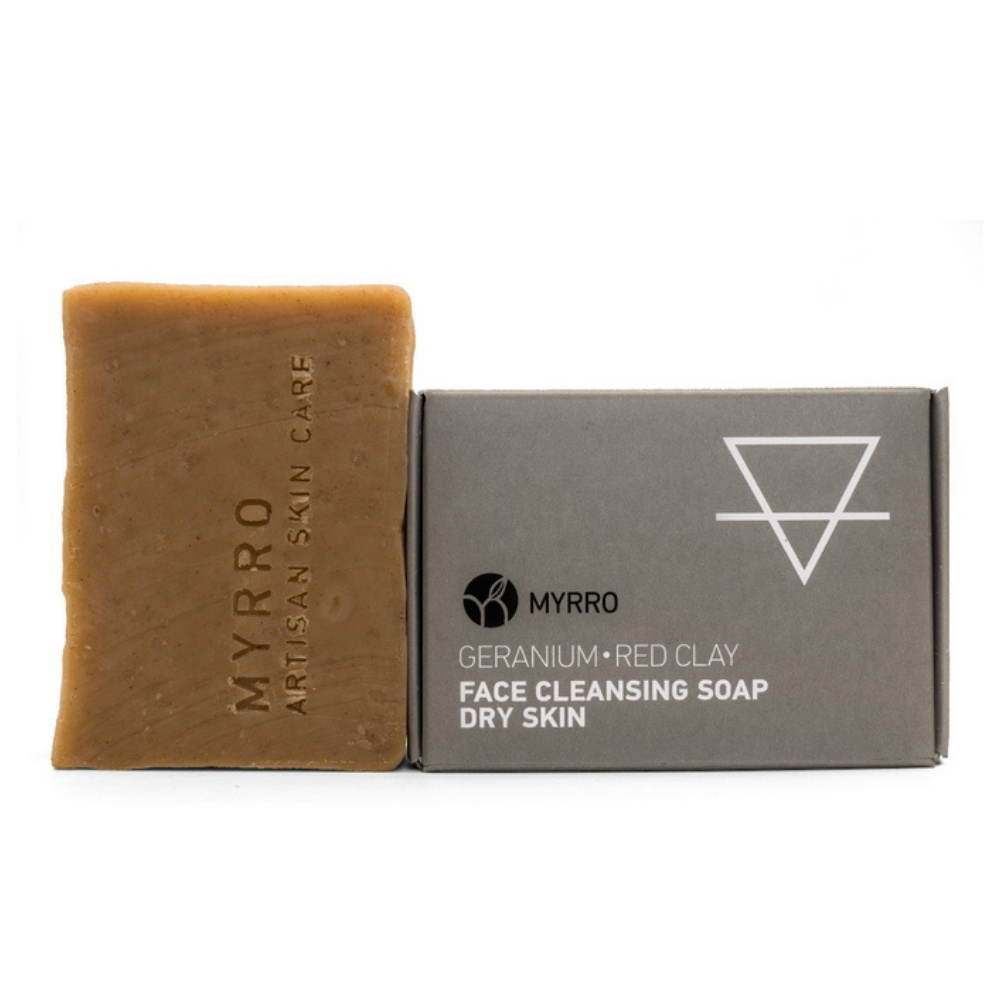Geraniové mýdlo s červeným jílem a organickým olivovým olejem z Kréty, čistí pokožku obličeje jemně a bez vysušování. Mýdlo určené pro suchou, unavenou, nebo zralou pleť, obsahuje éterický olej z pelargónie, hnědý cukr, červený jíl, sezam, olivový a ricinový olej.