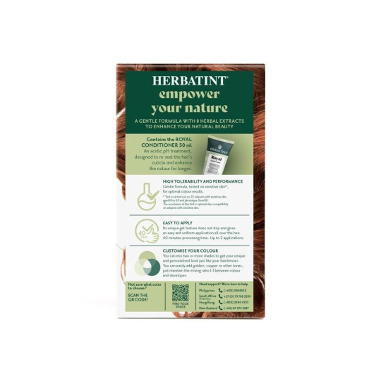 Barva dodá vlasům intenzivní barvu a lesk. Vlasy vypadají svěže, jsou zregenerované, hedvábně hladké a posílené. Díky gelové konzistenci má barva velmi jednoduchou aplikaci a je zcela bez zápachu. Celý proces barvení nezabere více než 40 minut. Navíc Herbatint netestuje své produkty na zvířatech a je také vhodný pro vegany. Na našem blogu se můžete podívat na vzorníček všech barev, které máme v e-shopu. Nezapomeňte, že výsledná barva po obarvení nemusí být vždy totožná s barvou na krabičce. Záleží na původní barvě vlasů, geneticky daném pigmentu ve struktuře Vašich vlasů, který se nemusí ukázat v přirozené barvě vlasů, ale některé Herbatint barvy ho mohou zvýraznit; dále na aktuální barvě (tzn. jaká barva byla aplikovaná před Herbatintem), nebo na tom, jestli máte odrosty, šediny nebo melír.