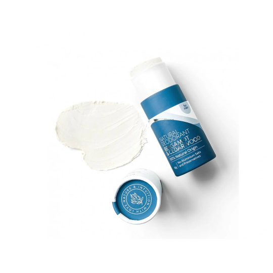 Jedlá soda, Kukuřičný škrob, Kokosový olej organický, Kokosový olej frakciovaný, Hroznový olej, Candellila Wax, Oxid zinku, Kakaové máslo dezodirizované, Zinc ricinoleate, triethyl citrate, Olivem® 900, Silica, Přírodní vitamín E, Extrakt z grapefruitových jader, Esenciální olej z cedrového dřeva, pačuli silice, grapefruitová silice, esenciální olej Bergamot