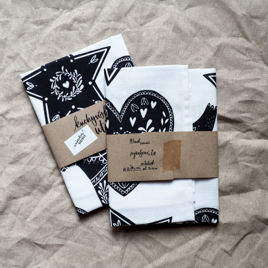 Utěrky jsou vyrobené metodou sítotisku, potisknuté v české dílně. Motiv je vytvořen dle originálního návrhu. Následně jsou utěrky doma ušité, z bavlněného plátna v bílé barvě a s láskou zabalené.
