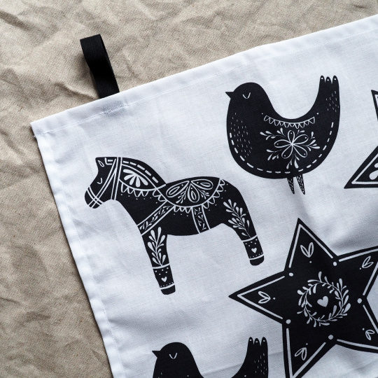 Jednostranně potisknutá utěrka z vánoční kolekce má rozměr 35 x 50 cm a černé poutko na zavěšení.