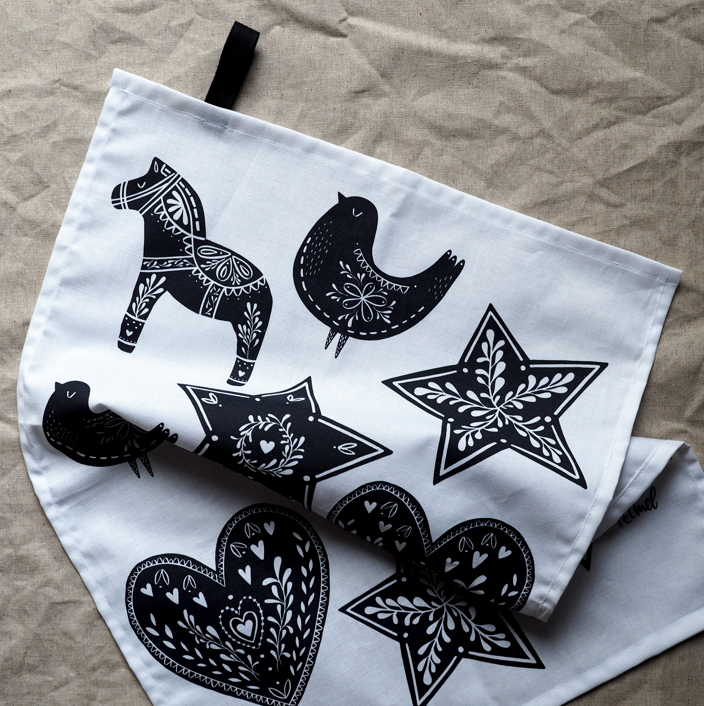 Jednostranně potisknutá utěrka z vánoční kolekce má rozměr 35 x 50 cm a černé poutko na zavěšení.