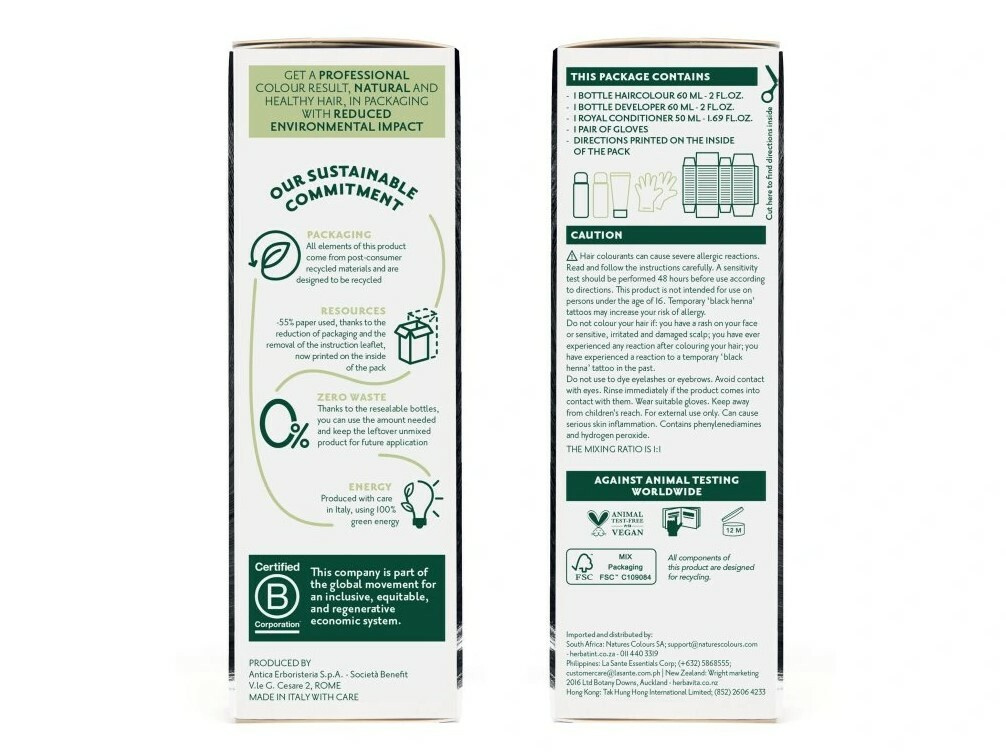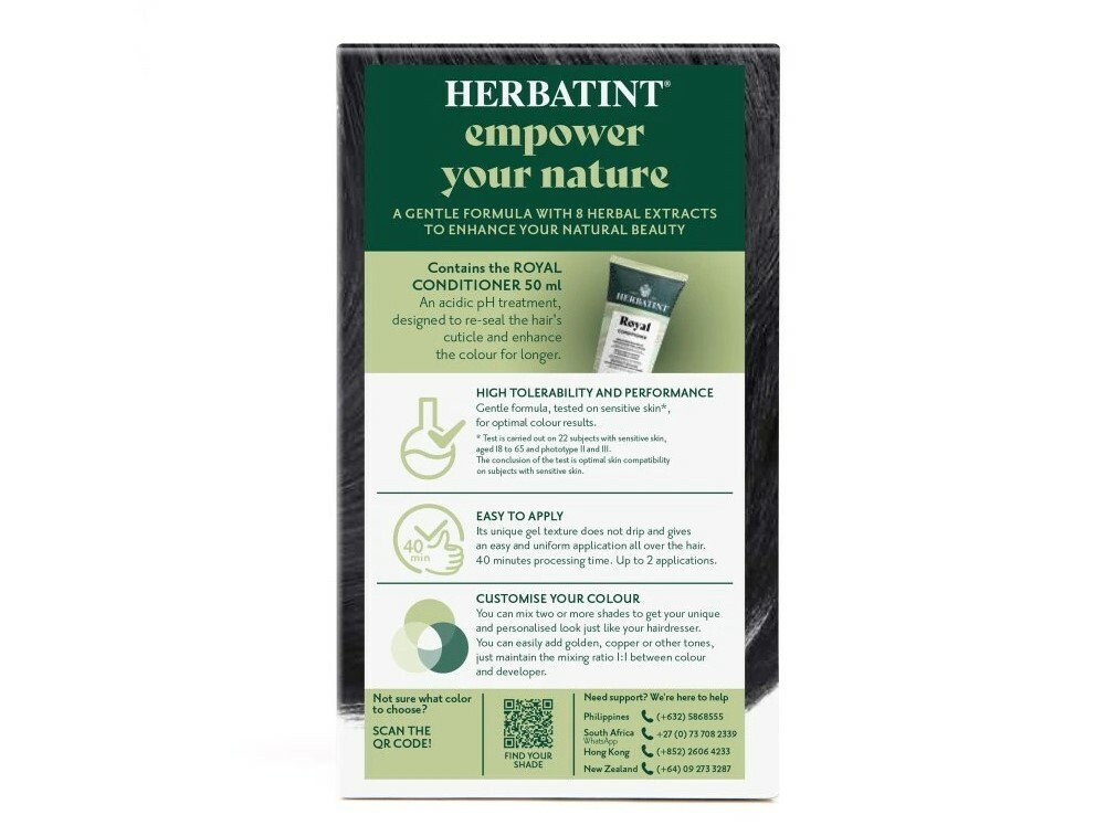 Permanentní barva na vlasy v odstínu Černá, obohacená o výtažky z osmi bylin, představuje přírodnější alternativu barvení vlasů s dlouhotrvajícím efektem, 100% krytím šedin a současnou péčí o vlasy a vlasovou pokožku. Bez amoniaku, resorcinolu, alkoholu, parabenů, parfemace, s velice nízkou koncentrací peroxidu. Barvy jsou dermatologicky testované na citlivou pokožku a při aplikaci jsou zcela bez zápachu. Barvy odstínové řady N, tj. přirozené (přírodní) odstíny od 1N do 8N kryjí 100% šedivé vlasy už při první aplikaci. Odstíny 9N a 10N mají velmi nízkou koncentraci barevných pigmentů, proto musí být smíchány s malým množstvím odstínu 8N, aby bylo dosaženo co nejlepšího krytí šedivých vlasů. Více o barvení šedivých vlasů si můžete přečíst v článku na našem blogu.