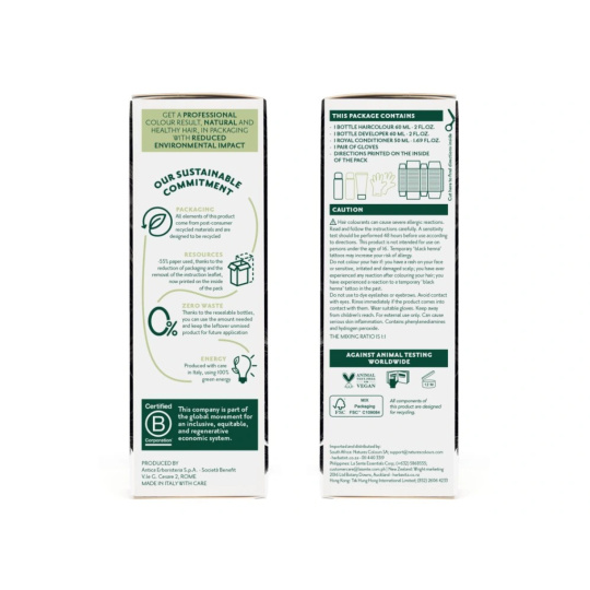 Inovované balení: menší krabička, ale větší obsah! O 55 % méně použitého papíru ve srovnání s předchozím balením díky zmenšené velikosti krabičky a odstranění letáku. Návod nyní najdete vytištěný na vnitřní straně krabičky. Místo vzorků najdete v balení 50ml Royal kondicionér, který díky svému kyselému pH vlas uzavře a zvýrazní barvu pro dlouhotrvající lesk.