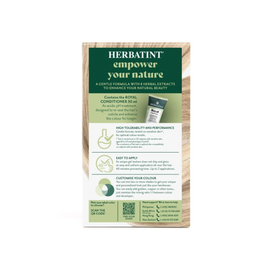 Barva dodá vlasům intenzivní barvu a lesk. Vlasy vypadají svěže, jsou zregenerované, hedvábně hladké a posílené. Díky gelové konzistenci má barva velmi jednoduchou aplikaci a je zcela bez zápachu. Celý proces barvení nezabere více než 40 minut. Navíc Herbatint netestuje své produkty na zvířatech a je také vhodný pro vegany. Na našem blogu se můžete podívat na vzorníček všech barev, které nabízíme v e-shopu. Nezapomeňte, že výsledná barva po obarvení nemusí být vždy totožná s barvou na krabičce. Záleží na původní barvě vlasů, geneticky daném pigmentu ve struktuře Vašich vlasů, který se nemusí ukázat v přirozené barvě vlasů, ale některé Herbatint barvy ho mohou zvýraznit; dále na aktuální barvě (tzn. jaká barva byla aplikovaná před Herbatintem), nebo na tom, jestli máte odrosty, šediny nebo melír.