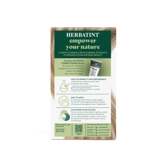 Barva dodá vlasům intenzivní barvu a lesk. Vlasy vypadají svěže, jsou zregenerované, hedvábně hladké a posílené. Díky gelové konzistenci má barva velmi jednoduchou aplikaci a je zcela bez zápachu. Celý proces barvení nezabere více než 40 minut. Navíc Herbatint netestuje své produkty na zvířatech a je také vhodný pro vegany. Na našem blogu se můžete podívat na vzorníček všech barev, které nabízíme v e-shopu. Nezapomeňte, že výsledná barva po obarvení nemusí být vždy totožná s barvou na krabičce. Záleží totiž na původní barvě vlasů, geneticky daném pigmentu ve struktuře Vašich vlasů, který se nemusí ukázat v přirozené barvě vlasů, ale některé Herbatint barvy ho mohou zvýraznit; dále na aktuální barvě (tzn. jaká barva byla aplikovaná před Herbatintem), nebo na tom, jestli máte odrosty, šediny nebo melír.