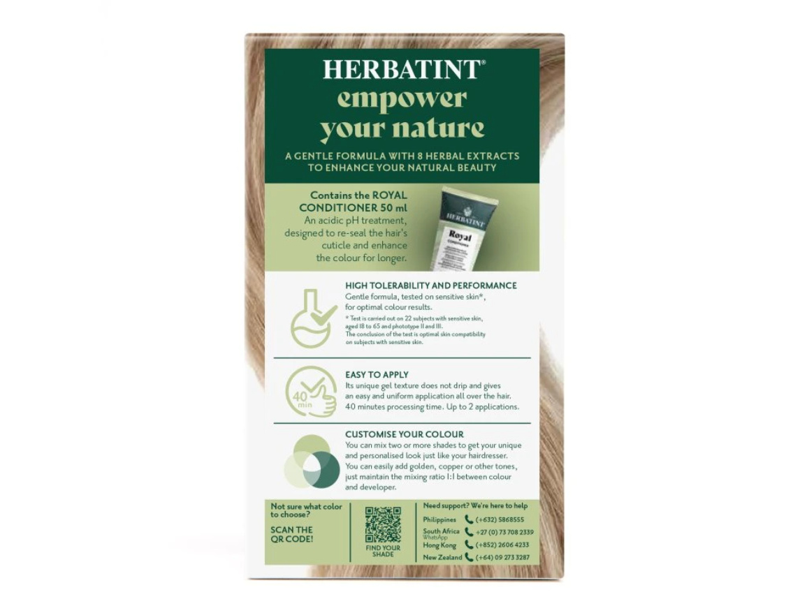 Barva dodá vlasům intenzivní barvu a lesk. Vlasy vypadají svěže, jsou zregenerované, hedvábně hladké a posílené. Díky gelové konzistenci má barva velmi jednoduchou aplikaci a je zcela bez zápachu. Celý proces barvení nezabere více než 40 minut. Navíc Herbatint netestuje své produkty na zvířatech a je také vhodný pro vegany. Na našem blogu se můžete podívat na vzorníček všech barev, které nabízíme v e-shopu. Nezapomeňte, že výsledná barva po obarvení nemusí být vždy totožná s barvou na krabičce. Záleží totiž na původní barvě vlasů, geneticky daném pigmentu ve struktuře Vašich vlasů, který se nemusí ukázat v přirozené barvě vlasů, ale některé Herbatint barvy ho mohou zvýraznit; dále na aktuální barvě (tzn. jaká barva byla aplikovaná před Herbatintem), nebo na tom, jestli máte odrosty, šediny nebo melír.