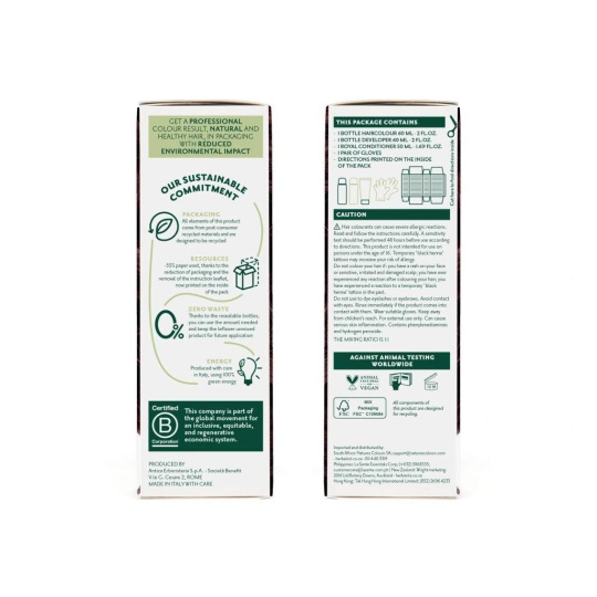 Barvicí emulze: Laureth-4, Propylene Glycol, Aqua (voda), PEG-2 Oleamine, Ethanolamine, Oleic Acid, Aloe Barbadensis Leaf Extract (extrakt z listu aloe vera), Hamamelis Virginiana Leaf Extract (extrakt z listu vilínu virginského), Betula Alba Leaf Extract (extrakt z listu břízy bílé), Echinacea Angustifolia Root Extract (extrakt z kořene třapatky úzkolisté), Juglans Regia Shell Extract (extrakt ze skořápky vlašského ořechu), Rheum Palmatum Root Extract (extrakt z kořene rebarbory), Cinchona Calisaya Bark Extract (extrakt z kůry chinovníku pýřitého), PEG-75 Meadowfoam Oil, Limnanthes Alba Seed Oil (mokřadový olej), P-Phenylenediamine, 2-Amino-3-hydroxypyridine, P-Aminophenol, M-Aminophenol, Tetrasodium EDTA, 4-Chlororesorcinol, Cetrimonium Chloride, Simethicone, Sodium Metabisulfite, Glycerin * Pocházející z organického zemědělství Vyvíjecí emulze: Aqua (voda), Hydrogen Peroxide, Etidronic Acid, Trideceth-9, Cetrimonium Chloride, Simethicone, Propylene Glycol, PEG-40 Hydrogenated Castor Oil.