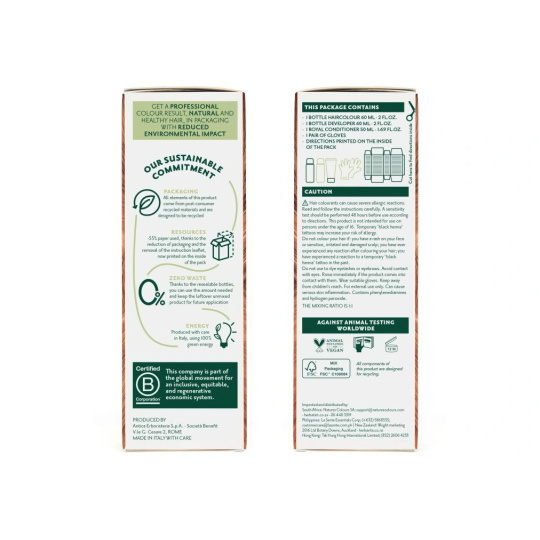 Inovované balení: menší krabička, ale větší obsah! O 55 % méně použitého papíru ve srovnání s předchozím balením díky zmenšené velikosti krabičky a odstranění letáku. Návod nyní najdete vytištěný na vnitřní straně krabičky. Místo vzorků najdete v balení 50ml Royal kondicionér, který díky svému kyselému pH vlas uzavře a zvýrazní barvu pro dlouhotrvající lesk.