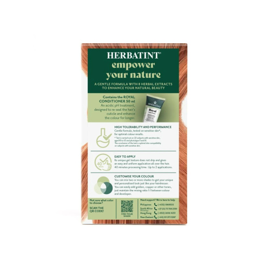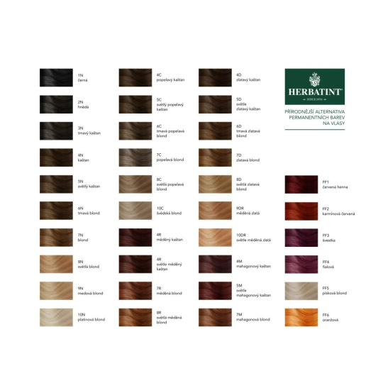 Barva dodá vlasům intenzivní barvu a lesk. Vlasy vypadají svěže, jsou zregenerované, hedvábně hladké a posílené. Díky gelové konzistenci má barva velmi jednoduchou aplikaci a je zcela bez zápachu. Celý proces barvení nezabere více než 40 minut. Navíc Herbatint netestuje své produkty na zvířatech a je také vhodný pro vegany. Na našem blogu se můžete podívat na vzorníček všech barev, které nabízíme v e-shopu. Nezapomeňte, že výsledná barva po obarvení nemusí být vždy totožná s barvou na krabičce. Záleží na původní barvě vlasů, geneticky daném pigmentu ve struktuře Vašich vlasů, který se nemusí ukázat v přirozené barvě vlasů, ale některé Herbatint barvy ho mohou zvýraznit; dále na aktuální barvě (tzn. jaká barva byla aplikovaná před Herbatintem), nebo na tom, jestli máte odrosty, šediny nebo melír.