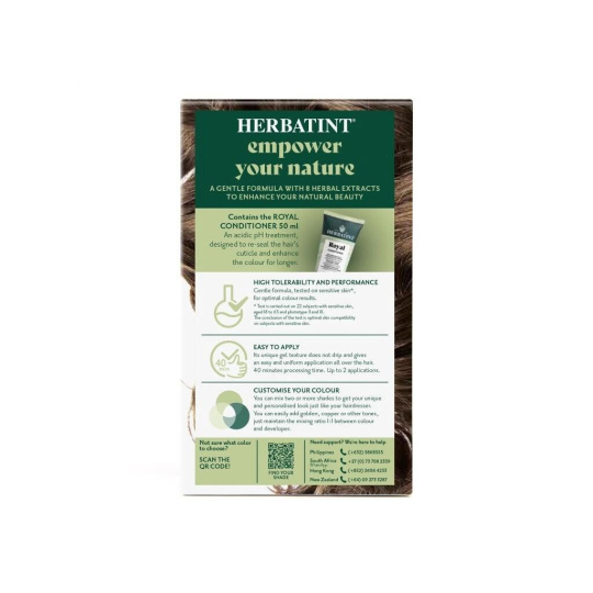 Barva dodá vlasům intenzivní barvu a lesk. Vlasy vypadají svěže, jsou zregenerované, hedvábně hladké a posílené. Díky gelové konzistenci má barva velmi jednoduchou aplikaci a je zcela bez zápachu. Celý proces barvení nezabere více než 40 minut. Navíc Herbatint netestuje své produkty na zvířatech a je také vhodný pro vegany. Na našem blogu se můžete podívat na vzorníček všech barev, které nabízíme v e-shopu. Nezapomeňte, že výsledná barva po obarvení nemusí být vždy totožná s barvou na krabičce. Záleží na původní barvě vlasů, geneticky daném pigmentu ve struktuře Vašich vlasů, který se nemusí ukázat v přirozené barvě vlasů, ale některé Herbatint barvy ho mohou zvýraznit; dále na aktuální barvě (tzn. jaká barva byla aplikovaná před Herbatintem), nebo na tom, jestli máte odrosty, šediny nebo melír.