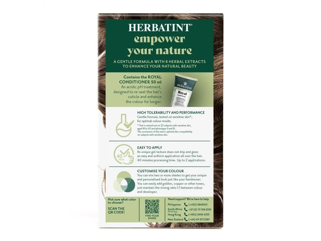 Barva dodá vlasům intenzivní barvu a lesk. Vlasy vypadají svěže, jsou zregenerované, hedvábně hladké a posílené. Díky gelové konzistenci má barva velmi jednoduchou aplikaci a je zcela bez zápachu. Celý proces barvení nezabere více než 40 minut. Navíc Herbatint netestuje své produkty na zvířatech a je také vhodný pro vegany. Na našem blogu se můžete podívat na vzorníček všech barev, které nabízíme v e-shopu. Nezapomeňte, že výsledná barva po obarvení nemusí být vždy totožná s barvou na krabičce. Záleží na původní barvě vlasů, geneticky daném pigmentu ve struktuře Vašich vlasů, který se nemusí ukázat v přirozené barvě vlasů, ale některé Herbatint barvy ho mohou zvýraznit; dále na aktuální barvě (tzn. jaká barva byla aplikovaná před Herbatintem), nebo na tom, jestli máte odrosty, šediny nebo melír.