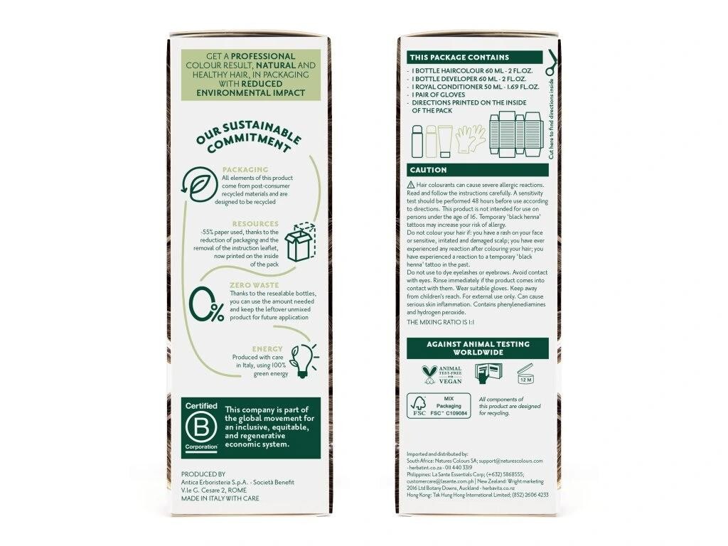Inovované balení: menší krabička, ale větší obsah! O 55 % méně použitého papíru ve srovnání s předchozím balením díky zmenšené velikosti krabičky a odstranění letáku. Návod nyní najdete vytištěný na vnitřní straně krabičky. Místo vzorků najdete v balení 50ml Royal kondicionér, který díky svému kyselému pH vlas uzavře a zvýrazní barvu pro dlouhotrvající lesk.