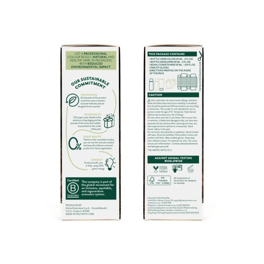 Barvící emulze: Laureth-4, Propylene Glycol, Aqua (voda), PEG-2 Oleamine, Ethanolamine, Oleic Acid, p-Phenylenediamine, Aloe Barbadensis Leaf Extract (extrakt z listu aloe vera), Hamamelis Virginiana Leaf Extract (extrakt z listu vilínu virginského), Betula Alba Leaf Extract (extrakt z listu břízy bílé), Echinacea Angustifolia Root Extract (extrakt z kořene třapatky úzkolisté), Juglans Regia Shell Extract (extrakt ze skořápky vlašského ořechu), Rheum Palmatum Root Extract (extrakt z kořene rebarbory), Cinchona Calisaya Bark Extract (extrakt z kůry chinovníku pýřitého), PEG-75 Meadowfoam Oil, Limnanthes Alba Seed Oil (mokřadový olej), 2-Methylresorcinol, 4-Chlororesorcinol, p-Methylaminophenol Sulfate, Tetrasodium EDTA, 2-Amino-3-Hydroxypyridine, Cetrimonium Chloride, Simethicone, Sodium Metabisulfite, Glycerin * Pocházející z organického zemědělství Vyvíjecí emulze: Aqua (voda), Hydrogen Peroxide, Etidronic Acid, Trideceth-9, Cetrimonium Chloride, Simethicone, Propylene Glycol, PEG-40 Hydrogenated Castor Oil.