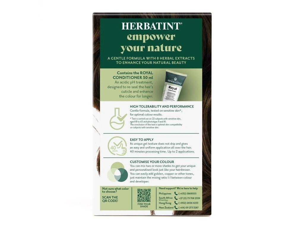 Barva dodá vlasům intenzivní barvu a lesk. Vlasy vypadají svěže, jsou zregenerované, hedvábně hladké a posílené. Díky gelové konzistenci má barva velmi jednoduchou aplikaci a je zcela bez zápachu. Celý proces barvení nezabere více než 40 minut. Navíc Herbatint netestuje své produkty na zvířatech a je také vhodný pro vegany. Na našem blogu se můžete podívat na vzorníček všech barev, které nabízíme v e-shopu. Nezapomeňte, že výsledná barva po obarvení nemusí být vždy totožná s barvou na krabičce. Záleží na původní barvě vlasů, geneticky daném pigmentu ve struktuře Vašich vlasů, který se nemusí ukázat v přirozené barvě vlasů, ale některé Herbatint barvy ho mohou zvýraznit; dále na aktuální barvě (tzn. jaká barva byla aplikovaná před Herbatintem), nebo na tom, jestli máte odrosty, šediny nebo melír.
