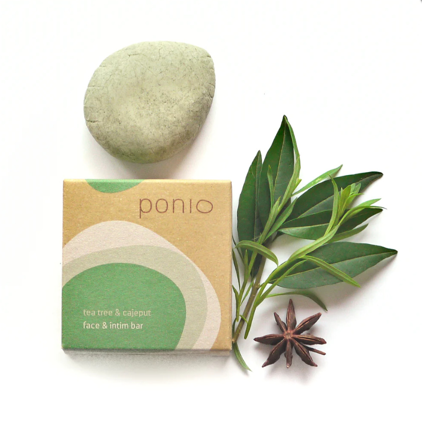 Pánský i dámský tuhý čistící prostředek Ponio bar Tea Tree a cajeput účinně odstraňují nečistoty, ale zároveň zachovávají přirozený lipidový plášť pokožky.