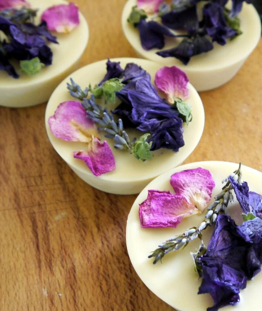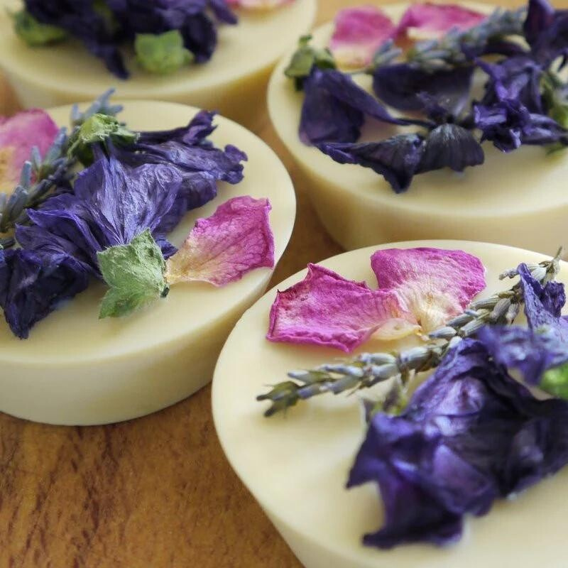 Sušené květy levandule, růže a slézu jsou pouze lehce přilepené na povrchu kostky; doporučujeme je před masáží odstranit.