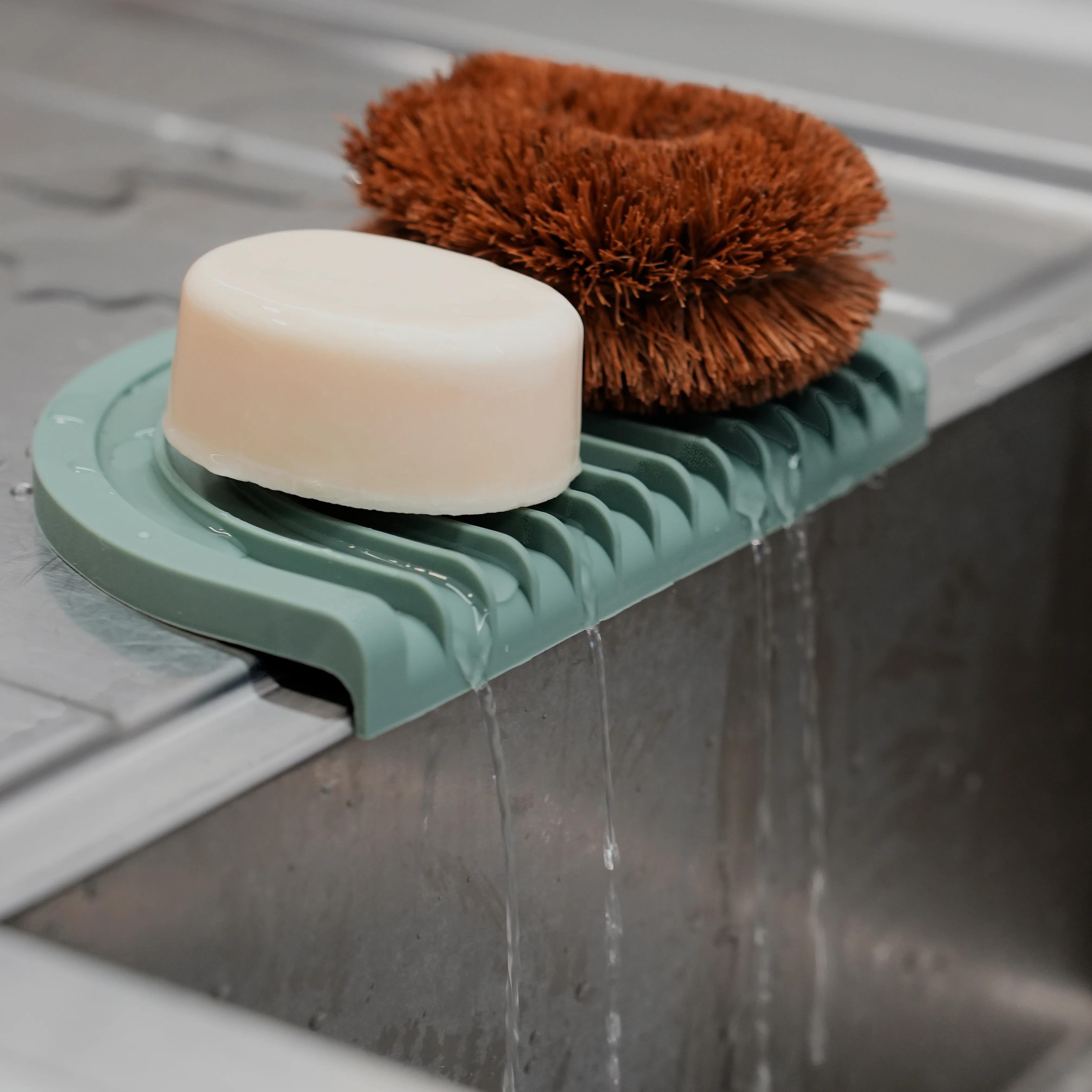 Odolná silikonová podložka, která vám usnadní život v koupelně i kuchyni. Díky praktickým drážkám a sklonu na jedné straně přebytečná voda automaticky odtéká a mýdlo nebo houbičky mohou rychle vyschnout.