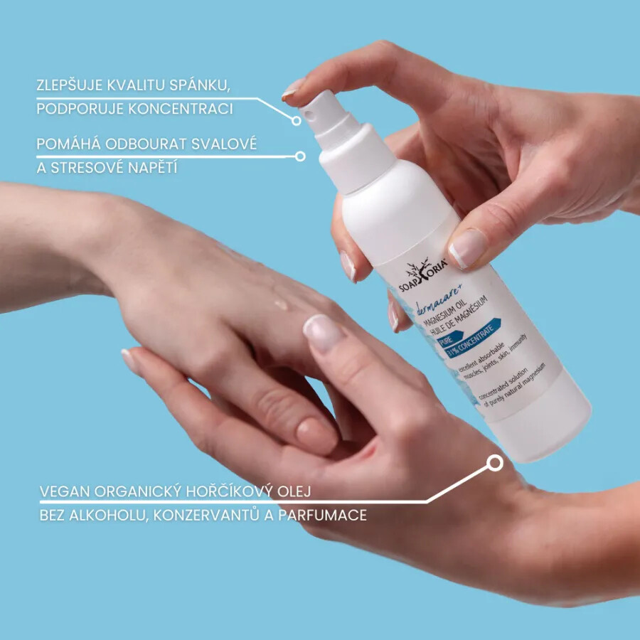 Magnesiový olej představuje vysoce koncentrovaný roztok čistě přírodního hořčíku, který pochází ze starodávného moře Zechstein. Je vhodný pro každodenní péči o tělo, protože přináší jedinečné zdravotní benefity. Hořčíkový olej je ideálním společníkem pro sportovce, aktivní jedince, ale i osoby s poruchami nervového a pohybového systému nebo spánku. Ocení jej také ekzematici, kteří trpí nepříjemnými kožními projevy. Pomáhá uvolnit svalové napětí po nadměrné zátěži, snižuje stres, zmírňuje únavu a vyčerpání. Optimální dávka hořčíku podporuje kvalitní spánek, protože reguluje hladinu melatoninu, hormonu spánku. Je důležitá pro syntézu neurotransmiterů, které ovlivňují náladu a mentální pohodu. Magnesium má protizánětlivé vlastnosti, které jsou prospěšné při řešení kožních problémů. Mezi nejčastější problémy patří akné nebo suchá a popraskaná pokožka.