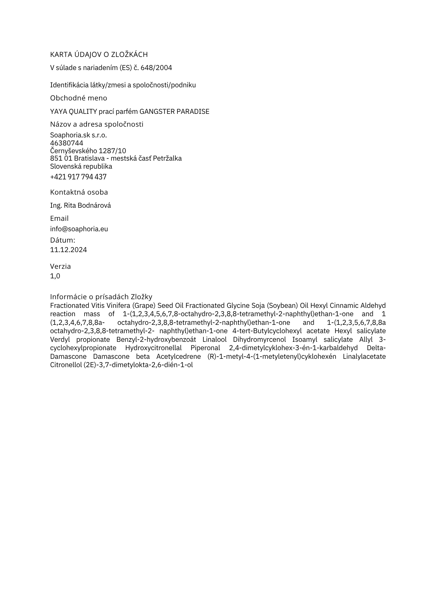 Biomasa získaná z frakcionovaného hroznového a sójového oleje (certifikováno RSPO), směs esenciálních olejů a přírodních extraktů.
