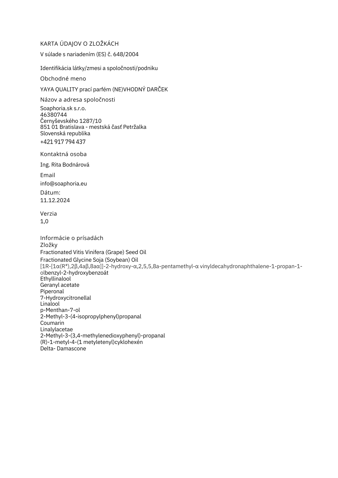 Biomasa získaná z frakcionovaného hroznového a sójového oleje (certifikováno RSPO), směs esenciálních olejů a přírodních extraktů.